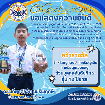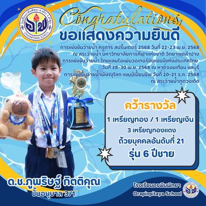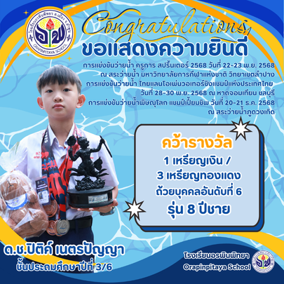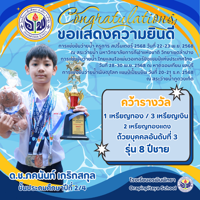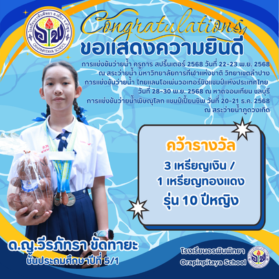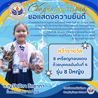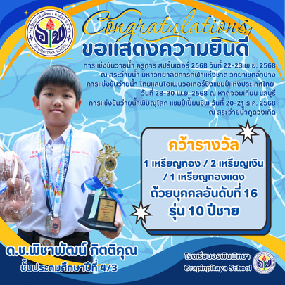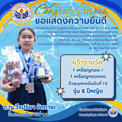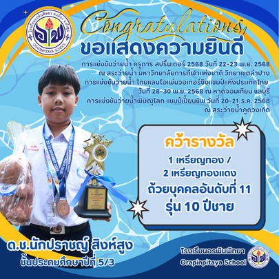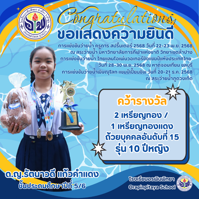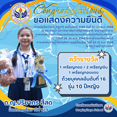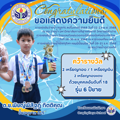 โรงเรียนอรพินพิทยาขอแสดงความยินดีกับกีฬาว่ายน้ำที่ได้รับรางวัลในรายการแข่งขันว่ายน้ำ ครูการ สปริ้นเตอร์ 2568 วันที่ 22-23 พ.ย. 2568 ณ สระว่ายน้ำ มหาวิทยาลัยการกีฬาแห่งชาติ วิทยาเขตลำปาง / การแข่งขันว่ายน้ำ ไทยแลด์โอเพ่นวอเทอร์ชิงแชมป์ประเทศไทย วันที่ 28-30 พ.ย. 2568 ณ หาดจอมเทียน ชลบุรี / การแข่งขันว่ายน้ำพิษณุโลก แชมป์เปี้ยนชิพ วันที่ 20-21 ธ.ค. 2568 ณ สระว่ายน้ำภูดงเกิด