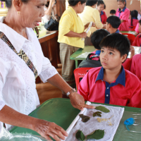 ต่อด้วยการทำ "ผ้าพิมพ์ลาย ด้วยใบไม้" เป็นการทำผ้าเช้ดหน้า ที่พิมพ์ลายด้วยการใช้ใบไม้หรือดอกไม้ มาวางบนผ้าดิบ แล้วนำไปนึ่ง จะทำให้สีของใบไม้หรือดอกไม้ ติดพร้อมกับผ้าที่นึ่งแล้ว และจะได้ผ้าที่ลวดลายและสีสันสวยงามจากธรรมชาติ |