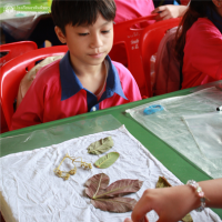 ต่อด้วยการทำ "ผ้าพิมพ์ลาย ด้วยใบไม้" เป็นการทำผ้าเช้ดหน้า ที่พิมพ์ลายด้วยการใช้ใบไม้หรือดอกไม้ มาวางบนผ้าดิบ แล้วนำไปนึ่ง จะทำให้สีของใบไม้หรือดอกไม้ ติดพร้อมกับผ้าที่นึ่งแล้ว และจะได้ผ้าที่ลวดลายและสีสันสวยงามจากธรรมชาติ |