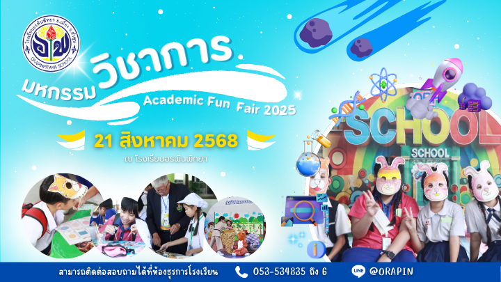 ติดตามข่าวสารได้ที่ : เพจโรงเรียนอรพินพิทยา - Orapinpitaya School ติดต่อสอบถาม โทร 053 - 534835 ถึง 6 มือถือ 0818813111 โทรสาร 053 - 561264 *** Line ID : @orapin
